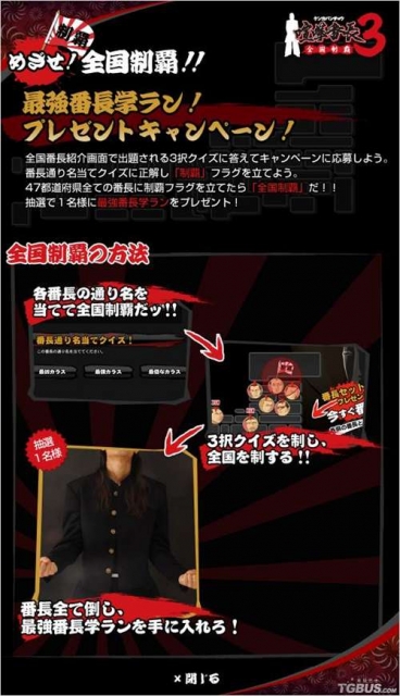 《喧哗番长3:全国制霸》再有几天就上市了,官方为了增加游戏的噱头,在官方网站进行了名为“全国制霸”的活动。只要玩家完全填对了47个番长的外号,就有机会获得全国制霸番长的代表服装。犹豫什么,还不赶快去参加活动!