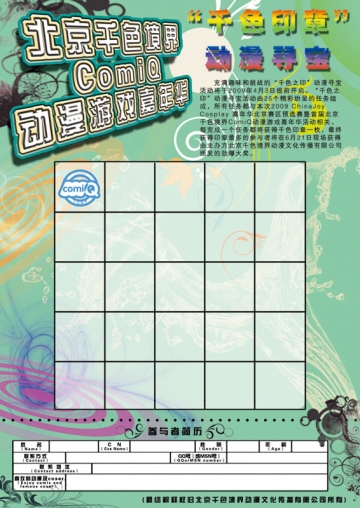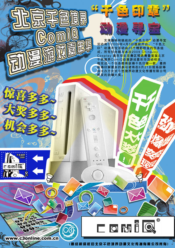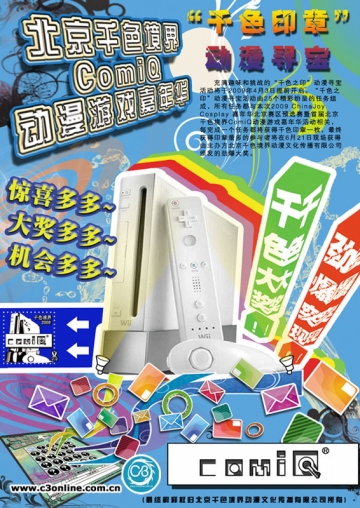 2009 ChinaJoy Cosplay 嘉年华北京赛区预选赛暨首届北京千色境界ComiQ动漫游戏嘉年华活动的预赛将于5月30日、31日在中关村E世界热情上演,而最终的总决赛将于2009年6月21日在海淀剧院隆重举行!活动举办期间,主办方北京千色境界动漫文化传播有限公司安排了丰富有趣的配套活动与大家共享,其中独树一帜的 “千色之印”动漫寻宝活动已经于2009年4月3日正式开启,神秘大奖之一经确认为体感电视游戏主机Wii一台!
