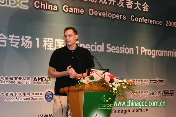 Tim Sweeney先生作为全球顶级游戏开发商业引擎公司的缔造者已经很少出席国际性活动并在公开场合授课了。然而他作为一位游戏行业杰出的先进技术倡导者是真正意义上的“教父级技术专家”。年仅39岁的他同时作为nVidia和ATI公司的技术顾问并于全球两大主机供应商微软和索尼保持良好的合作关系,在XBOX的硬件设计过程中,因为Tim的一个关键性改进建议使得微软Xbox360的硬件投入增加了10亿美金,而后微软方面评价这一改进是帮助Xbox360赢得了全球玩家的心。如此传奇技术天才的现场授课的确称得上是“金口玉言”了,在课程中他展望了未来5年后的技术趋势,告诉我们如果当前开发的产品准备在5年后上市,需要考虑到哪些技术问题。其资深的技术背景,使其的讲解非常符合技术人员的口味,因此他的讲解受到参会技术人员的普遍好评,现场参会的CGDC顾问团成员们也是交口称赞。