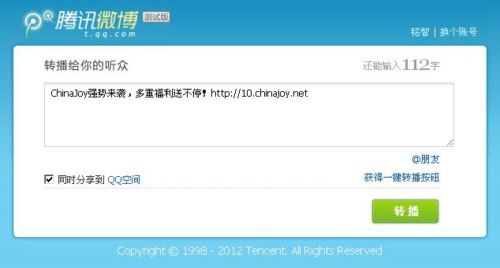 ChinaJoy腾讯官方微博:http://t.qq.com/ChinaJoy/