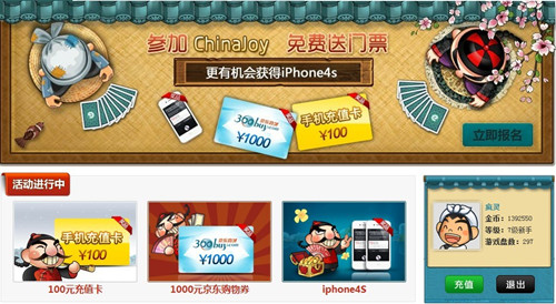 《天天斗地主》ChinaJoy超级大奖赛火爆进行,海量手机充值卡等豪礼疯狂放送,手机打到爆再不用担心!预选赛、预赛、半决赛、决赛四大阶段赛事不断开启,更有千元京东购物券,iPhone4S以及2012年ChinaJoy门票天天发放。