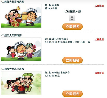《天天斗地主》ChinaJoy超级大奖赛自2012年6月18日在联众新世界、新浪微博微游戏两大平台同步开启,截止至7月18日将进行为期一月的比赛。大奖赛分为满24人即开赛的预选赛、每周六进行的预赛以及半决赛、决赛四个阶段,除了免费报名参赛的预选赛外,其他三个阶段比赛都要消耗“赛点”报名参赛。自比赛开启一周以来,已经有众多玩家参赛,赢得比赛积攒赛点成为现在玩家游戏的最大目标。