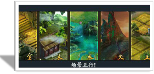 场景的五行属性设定并不是一成不变的,每一个场景的五行属性根据时间的推进而进行有规律变化,每一个地图的变化顺序均不一样。