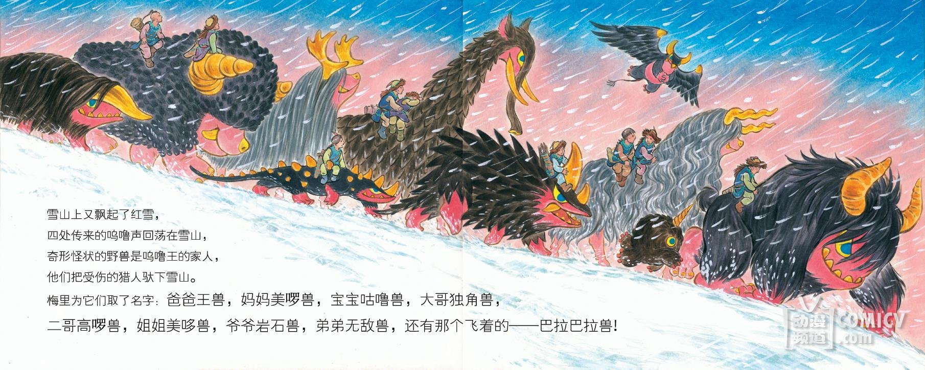 “呜噜王”是一只中国的雪山怪兽,关于它的故事,都在景绍宗先生的新书《梅里的雪山怪兽》中。景绍宗先生在书中为我们描绘了一个色彩浓郁而又不失清新的中国式童话:梅里与好朋友冈布、格桑是生活在雪山脚下的孩子,冈布和格桑都有他们的野兽伙伴:野马和金雕,而梅里却没有。在一次偶然间,梅里发现了混在牦牛群中,偷喝牛奶的“呜噜王”,从而与它成为了伙伴。时间一天天过去,“呜噜王”在慢慢长大,而它与梅里的友情也变得更加深厚。长大的“呜噜王”为村子里带来了一场不小的“怪兽”风波,甚至引发了雪崩,但在梅里与“呜噜王”以及朋友们的一起努力下,终于化解了危难,拯救了他们的村庄。