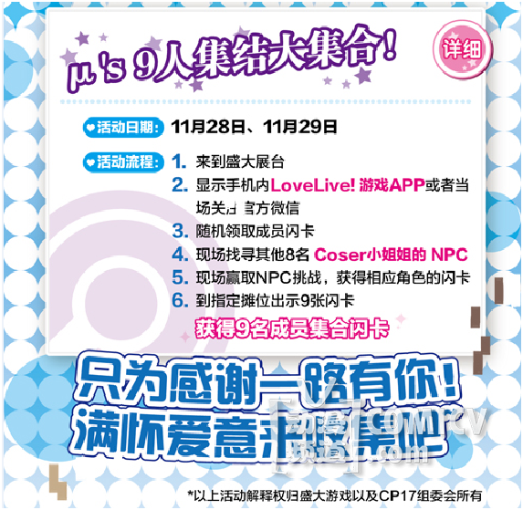 在cp17会有婚纱装扮的等身看板,μ's九人将带着她们的未来和梦想,披上花嫁等待各位合影。和同样来到这里的你们,成为合而为一的光芒。本活动由盛大官方直参,只为感谢一路相伴的各位LLer,友情与笑容,永远不会改变。μ's~fight哒呦!