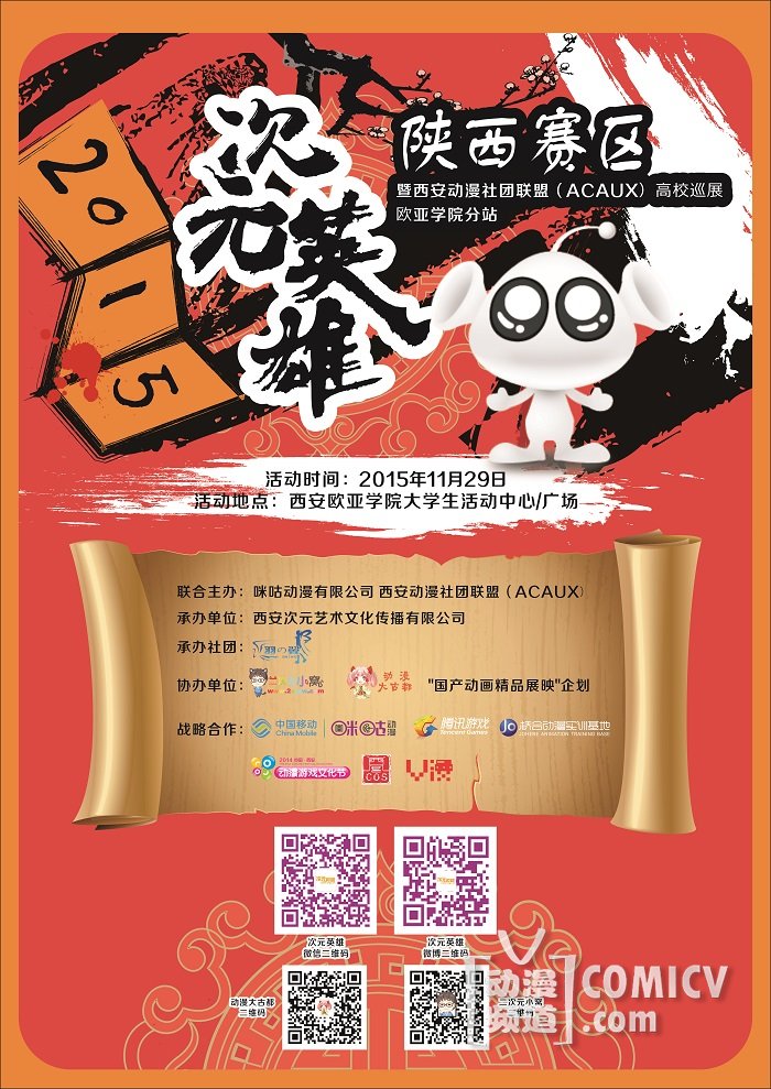 2015次元英雄陕西赛区,将举办“原创次元英雄”、“COS次元英雄”两大赛事,此次次元英雄赛事同西安动漫社团联盟(ACAUX)高校巡展合作,是其首次将地区分赛区直接投放校园落地活动,同时也是西安动漫社团联盟(ACAUX)高校巡展首次引入大型赛事,两个“首次”将碰撞出全新的活动模式,赛事将会邀请专业人士对参赛选手进行评审,“COS次元英雄”赛事将由毕胜(西安次元艺术文化传播有限公司CEO、西安动漫社团联盟主席)、忧郁の小胖(资深动漫媒体人、西安动漫社团联盟副主席)携次元艺术文化工作室诸位次元生及特邀嘉宾评委COSER谈天、COSER羽月组成评委阵容,“原创次元英雄”将有西安本土知名漫画家担当特邀评审。届时百余陕西本土社团将会为最终晋级名额展开争夺,谁能代表陕西争夺次元英雄宝座,让我们拭目以待!中国移动咪咕动漫现场也准备了精彩的礼品福利大放送!