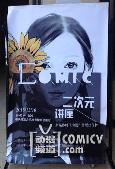 2015年12月18日下午,由北京市新闻出版广电局主办、二次元界和中央民族大学美术学院承办的“新媒体时代的动漫作品版权保护”校园宣传活动在中央民族大学美术学院举行。二次元界CEO蒋军华、北京市新闻出版广电局二次元界工作站站长刘宏强、中央民族大学美术学院副院长高润喜和200多名师生代表参加了此次活动。