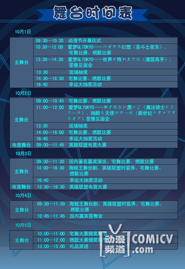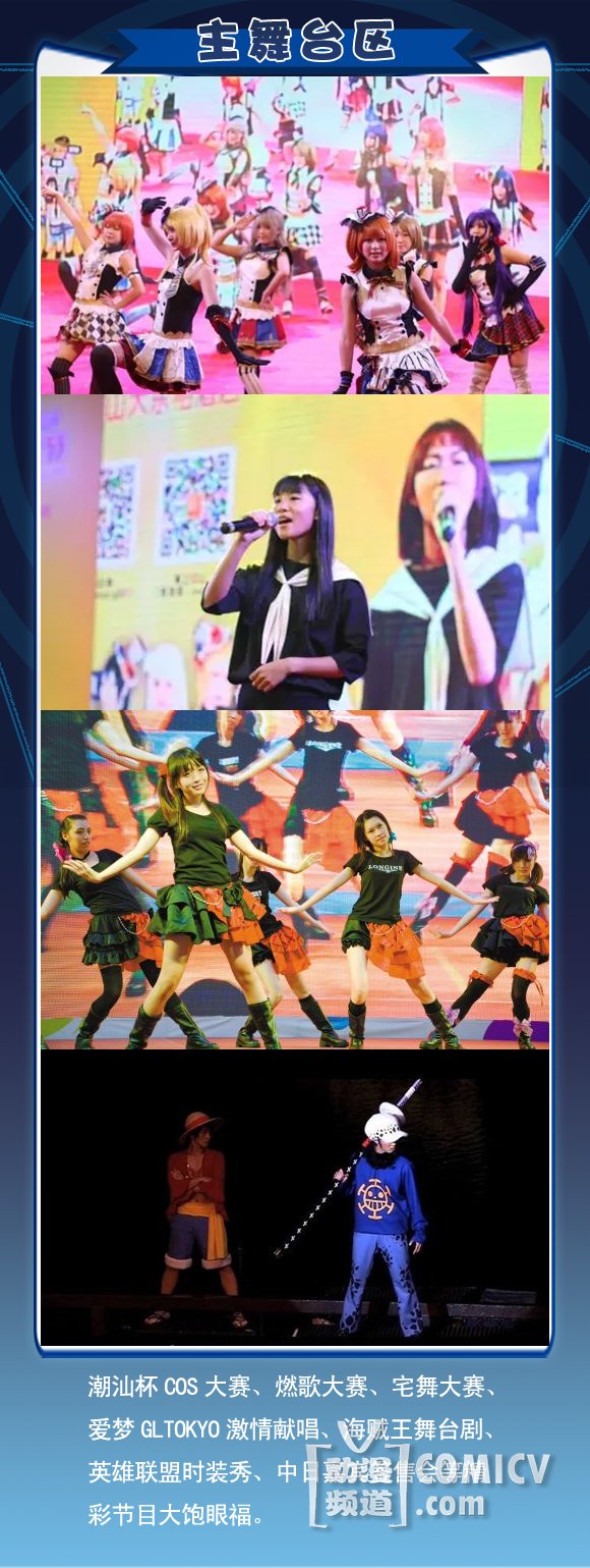 主舞台:潮汕杯COS大赛、燃歌大赛、宅舞大赛、爱梦GLTOKYO激情献唱、海贼王舞台剧、英雄联盟时装秀、中日嘉宾签售会等精彩节目大饱眼福