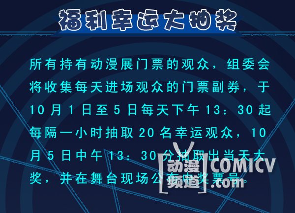 所有持有动漫展门票的观众,组委会将收集每天进场 观众的门票副券,于10月1日至5日每天下午13:30起每隔一小时抽取20名幸运观众,10月5日中午13:30分抽取出当天大奖,并在舞台现场公布中奖票号。