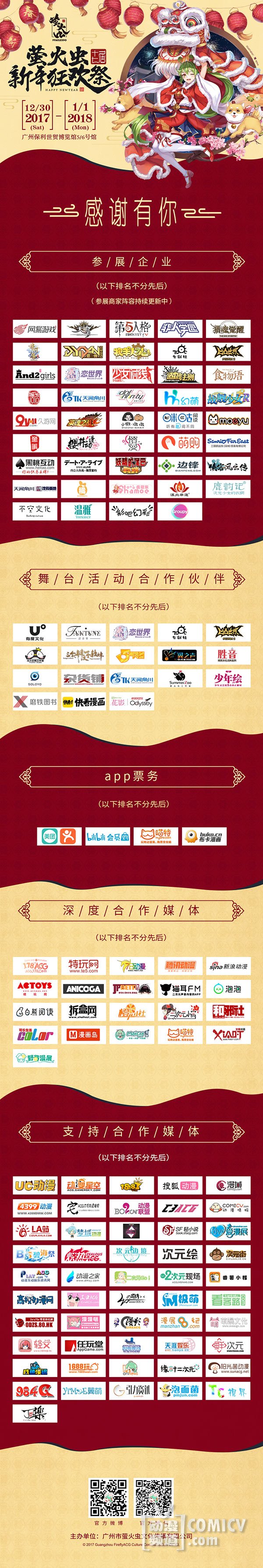 本届萤火虫新年狂欢祭不仅有各大人气嘉宾助阵,更有网易游戏、腾讯游戏、久游网、天闻角川、完美世界、边锋网络、黑桃互动、第一弹、西山居、1MORE万魔耳机等品牌厂商实力加盟!