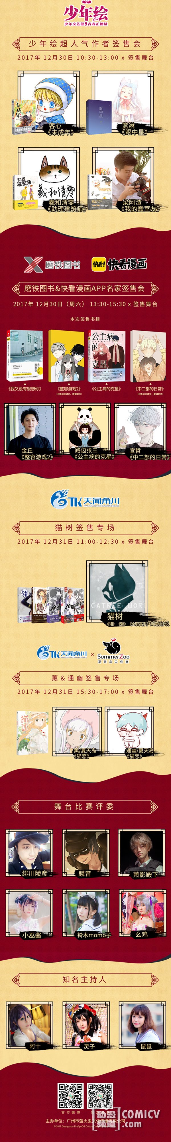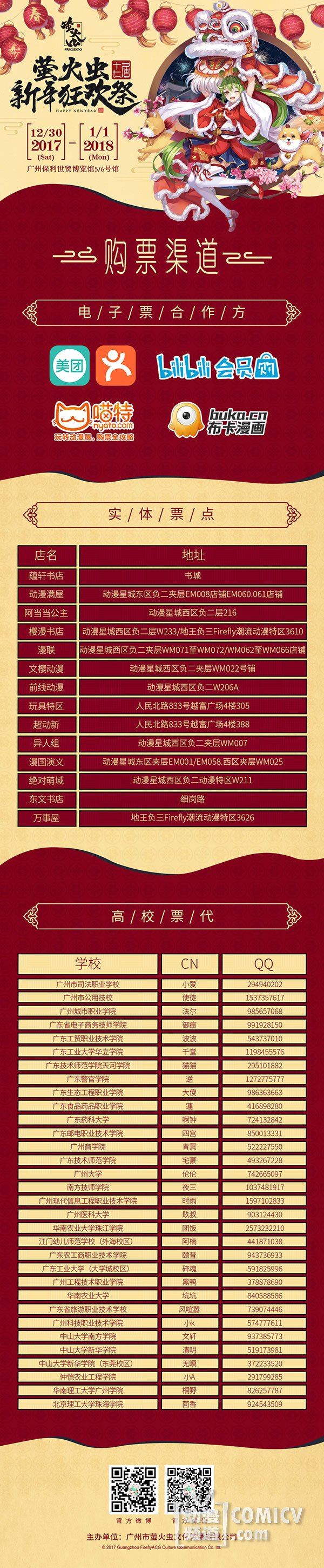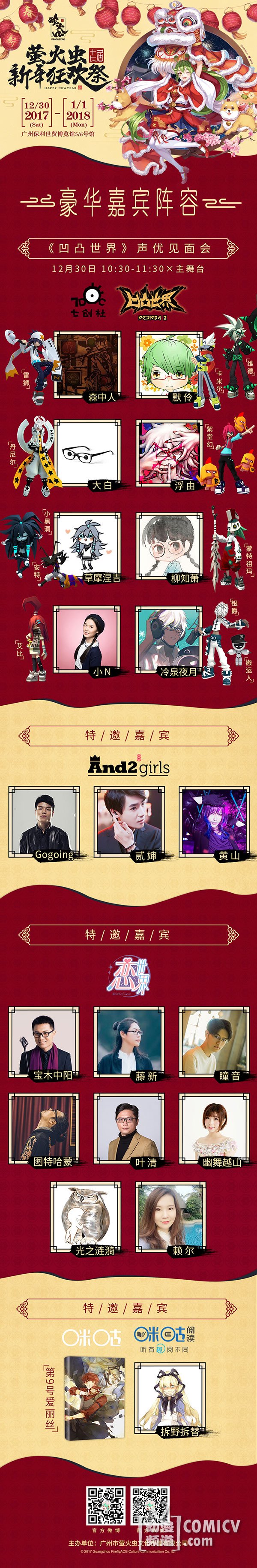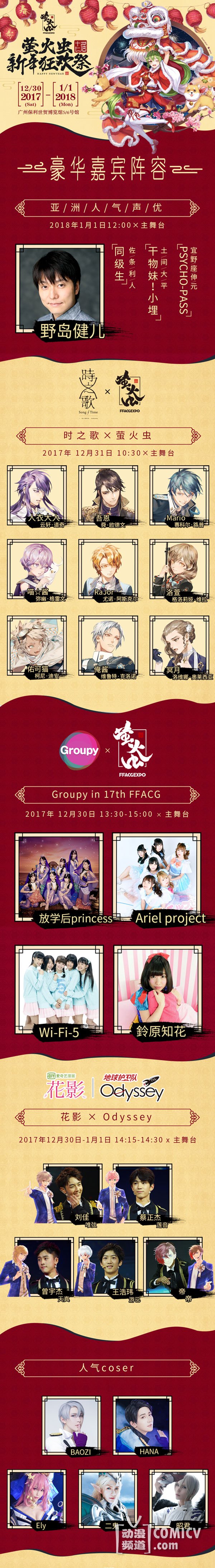 2017/12/30-2018/1/1(共3天),广州保利世贸博览馆,第17届萤火虫动漫游戏嘉年华火热筹备中,秋叶原祭、模魂祭、萤火祭、御祭礼等萤火虫特色区域火力全开!近百超人气红星齐聚妖都,绝对会让你们惊喜爆炸的嘉宾阵容,更有豪华参展品牌重磅加盟,你最期待的线下互动体验应有尽有!更多亮点快跟虫娘一起来看看吧~