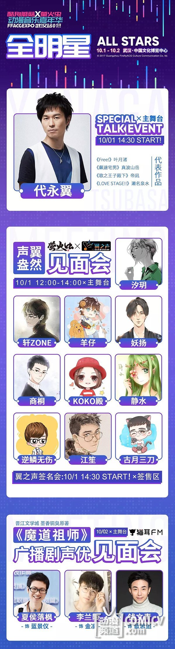 本次10月,虫娘将同时于武汉&上海两地举办漫展,而作为萤火虫漫展的武汉首站,虫娘将为小伙伴们带来众多国内外人气嘉宾!曾为人气角色叶月渚、真波山岳献声的亚洲知名CV代永翼也将来到武汉进行见面会!除了已经确定的多位国内知名二次元超红星,虫娘之后还会公布几位神秘嘉宾哦~敬请期待!